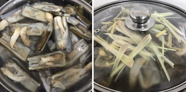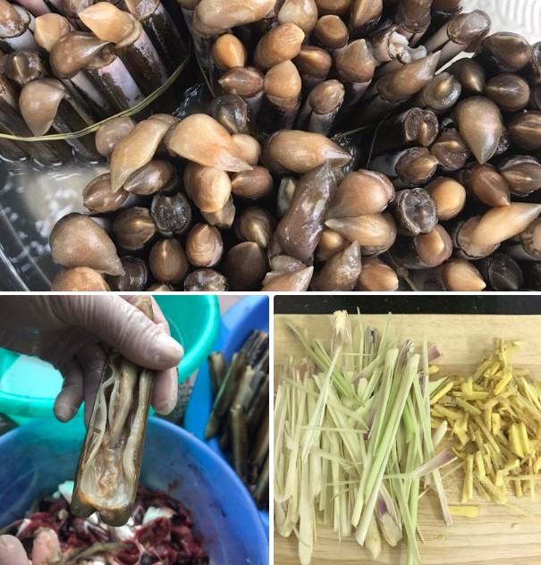 Đầu tiên, rửa sạch ốc móng tay rồi dùng dao cắt 1 đường dọc ở giữa để loại bỏ phần nội tạng bên trong. Sau đó, bạn rửa sạch ốc lại 1 lần nữa.