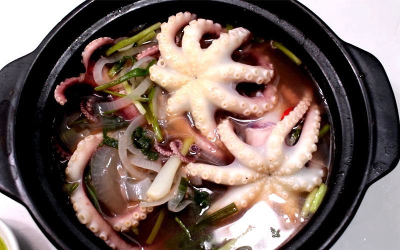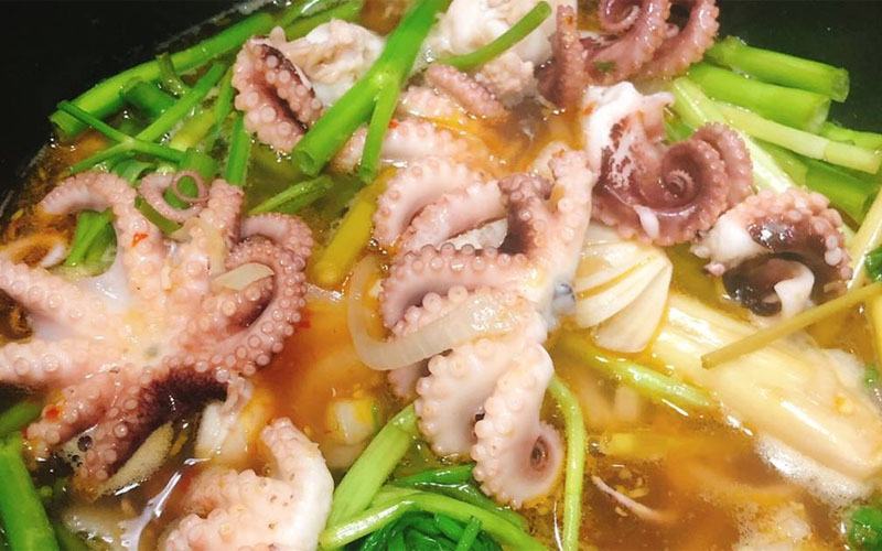 Sau khi nêm xong, bạn đợi nước sôi già khoảng 7 – 10 phút thì cho bạch tuộc vào. Khi bạch tuộc chín, bạn cho thêm hành lá và rau mùi vào là có thể thưởng thức.