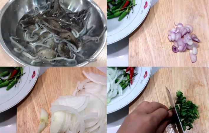 Bạch tuộc mua về bạn dùng kéo cắt bỏ mắt, túi mực và nội tạng bên trong. Cho bạch tuộc vào tô, bóp thật kỹ với muối để khử sạch nhớt và mùi tanh. Sau cùng bạn rửa chúng lại với nước một lần nữa rồi để ráo.Hành tím, hành tây bạn bóc vỏ, rửa sạch, cắt mỏng. Hành lá bóc vỏ, rửa sạch cắt thành từng khúc dài khoảng 3 – 4cm, để riêng đầu hành làm nước giấm. Rau mùi rửa sạch, cắt nhỏ.