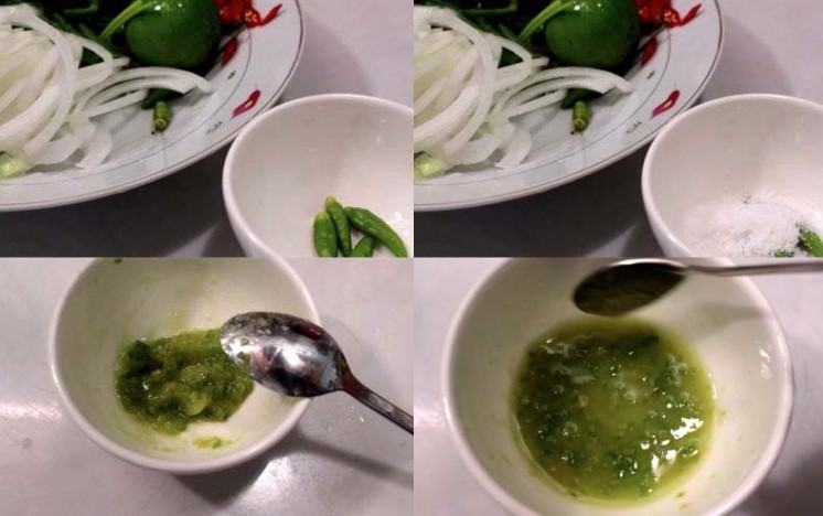 Cho từ 3 – 5 trái ớt xanh vào trong chén, cho thêm 1 muỗng cà phê đường, 1 muỗng cà phê muối, 1 chút xíu bột ngọt rồi giã nhuyễn. Tiếp theo cho khoảng 2 muỗng cà phê nước cốt chanh vào khuấy đều là có ngay một chén nước chấm ngon.