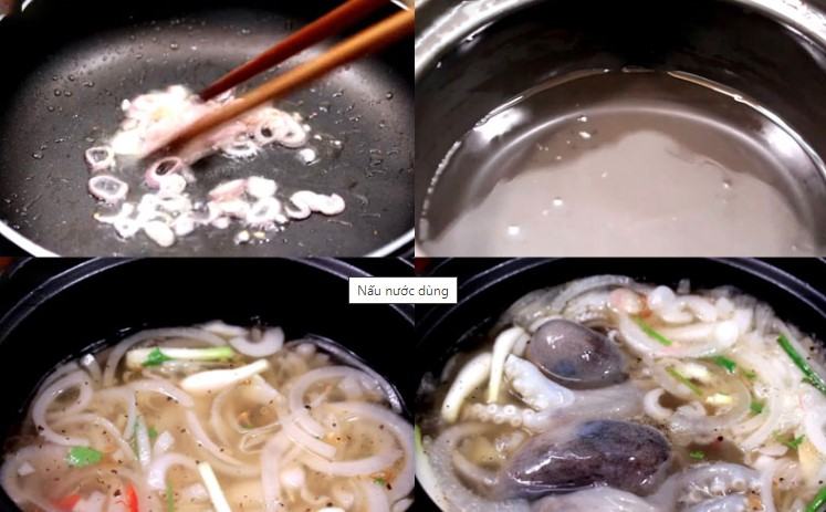 Cho vào nồi 1 chén giấm ăn và 1 chén nước sạch. Sau khi nước sôi, cho hành tây và hành tím đã phi thơm vào. Nêm thêm 1 muỗng cà phê muối, 1 muỗng cà phê hạt nêm, 1 muỗng cà phê tiêu xay, 1 muỗng canh nước mắm, đầu hành và ớt đỏ cắt nhỏ vào để tăng mùi vị cho món ăn.