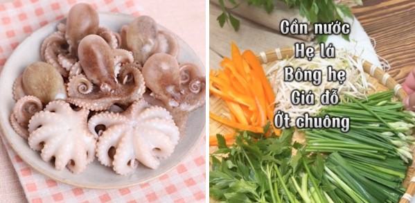 Làm sạch các nguyên liệu trước khi chế biến. Bạch tuộc cắt miếng vừa ăn, hẹ cắt khúc, xay nát tỏi bằng máy xay chuyên dụng.