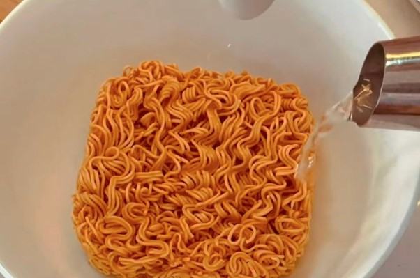 Cho 2 gói mì tôm vào bát, đổ nước sôi vào trụng nhanh rồi vớt ra (bạn có thể sử dụng loại mì nào mà mình yêu thích).