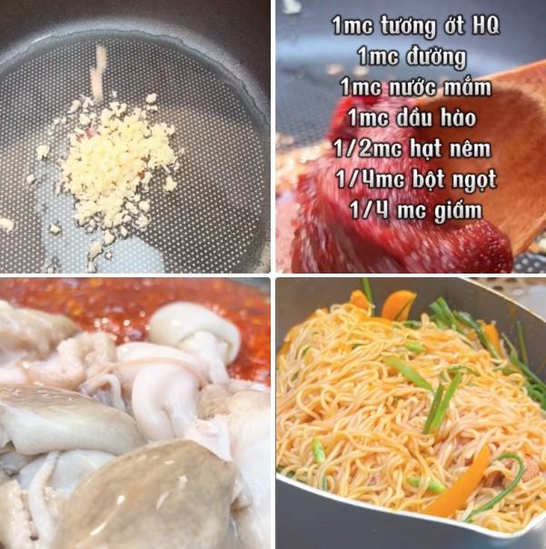 Bắt chảo dầu lên bếp rồi cho tỏi vào phi thơm. Cho bạch tuộc đã ngâm đá vào chảo chiên rồi đảo đều. Thêm vào lần lượt 3 muỗng canh dầu hào, 2 muỗng canh nước tương. Tiếp tục cho hẹ, giá vào chảo trộn đều cho thấm gia vị sau đó cho mì đã trụng vào tiếp tục xào đều đến khi chín.