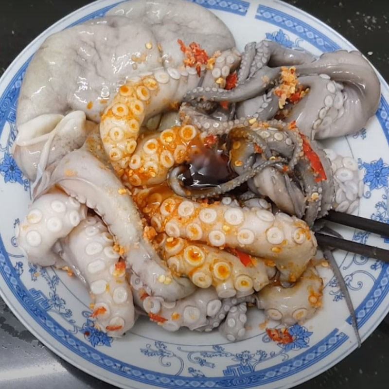 Bạch tuộc bạn làm sạch, cắt bỏ nội tạng, chà xát với muối cho bạch tuộc không còn mùi tanh, rửa lại với nước sạch và để ráo.