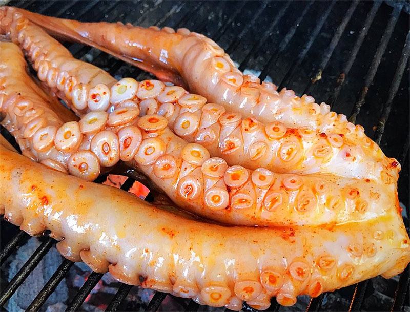 Sau khi bạch tuộc đã ngấm gia vị thì tiến hành nướng bạch tuộc trên bếp than cho đến khi bạch tuộc vàng đều và có mùi thơm. Cho bạch tuộc ra một cái đĩa nhỏ cắt miếng vừa ăn, bày trí cùng với một ít rau răm, dưa leo, chuối chát, và khế. Cuối cùng chúng ta chỉ việc thưởng thức chúng với muối tiêu chanh, tương ớt, hoặc muối ớt xanh.