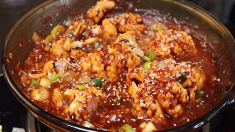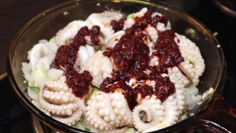 Rửa sạch các loại rau củ và thái lát chúng. Bạn trộn bột ớt với đường, mắm tôm, nước tương, dầu mè, 1 chút tiêu và tỏi băm. Làm nóng chảo với dầu rồi cho bạch tuộc vào xào khoảng 1 phút; và xúc ra để sang một bên.