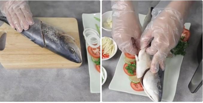 Bạn xoa lên mình cá 1 muỗng cà phê muối tiêu cho muối thấm đều, sau đó cho 1/2 phần hành lá, 1/2 phần gừng cắt sợi, 1/2 phần tỏi cắt lát và 1/2 phần ớt cắt lát vào bên trong bụng cá ướp khoảng 10 phút.