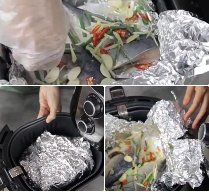 Bạn lót 1 lớp giấy bạc vào khay của nồi chiên không dầu, sau đó cho cá cam đã ướp vào, quét lên mình cá 1 lớp dầu ăn, sau đó cho hết phần hành lá, gừng, tỏi, ớt lên trên bề mặt cá, nhẹ nhàng bọc giấy bạc lại cho vào nồi chiên.