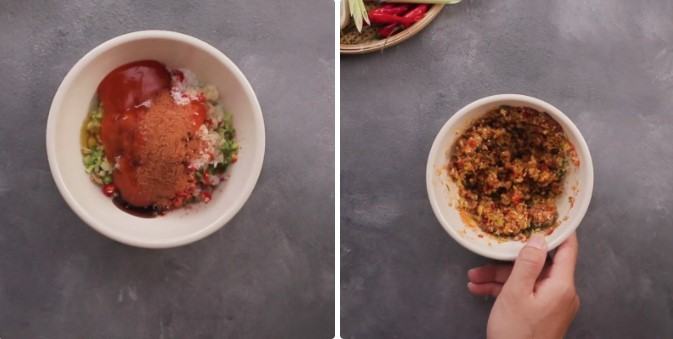 Cho vào tô 3 muỗng canh sả băm, 2 muỗng canh hành lá cắt nhỏ, 1 muỗng canh tỏi băm, 1 muỗng canh hành tím băm, 3 trái ớt băm, 1 muỗng canh dầu hào