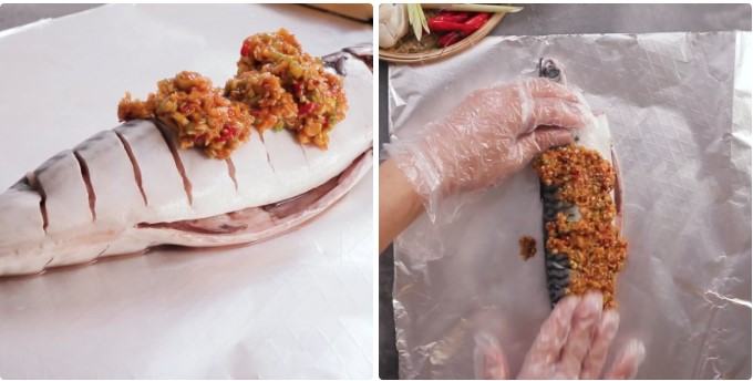Xoa đều phần hỗn hợp ướp cá lên 2 bên mặt và trong bụng cá ướp khoảng 5 phút cho cá thấm vị.