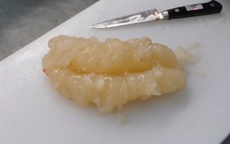 Tương tự bạn đâm mũi dao vào theo vỏ lưng tôm, rạch từ từ từng chút một để tách rời phần thịt tôm. Lúc này bạn có thể loại bỏ đi chỉ tôm.