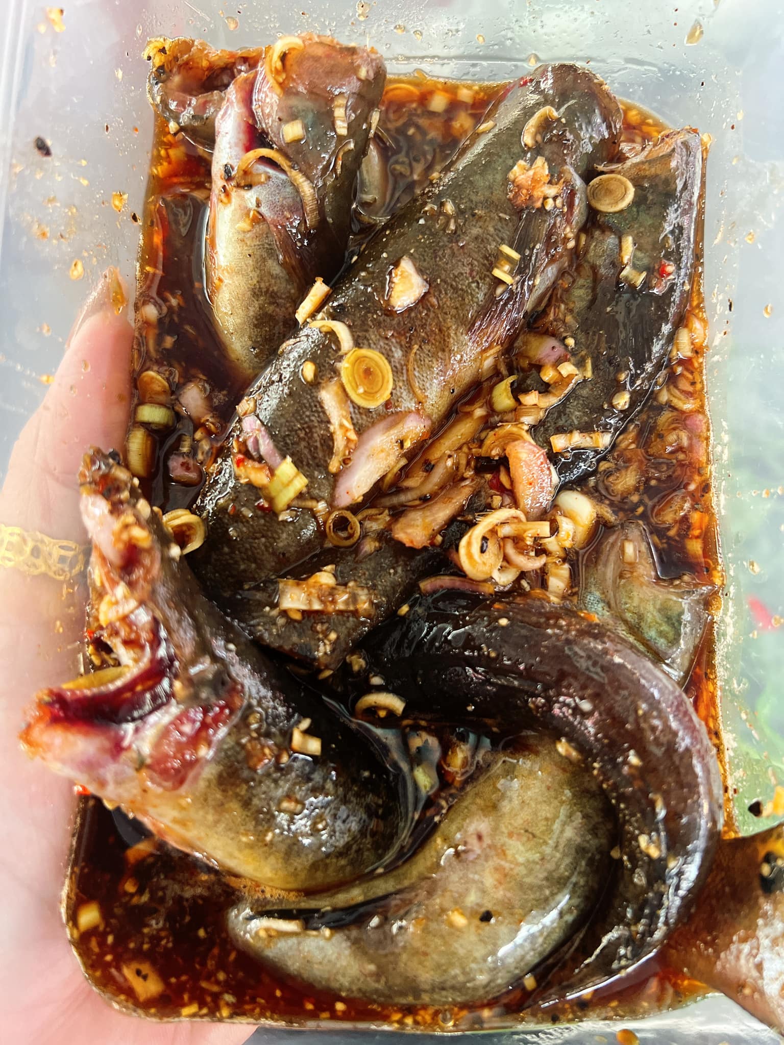 Tiếp theo đó chính là ướp cá, một miếng cá ngon thì không thể bỏ qua được công đoạn ướp cá. Bạn hãy cho các nguyên liệu đã được chuẩn bị từ trước như nước mắm, ớt băm, bột ngọt, đường , tiêu và dầu ăn lên những miếng cá rồi trộn và xoa bóp đều rồi đợi khoảng 15 phút cho đến công đoạn tiếp theo.