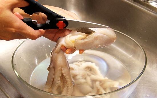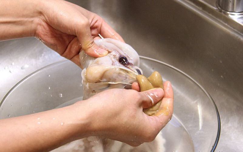 Bạch tuộc trứng sau khi mua về phải được tách ra để loại bỏ phần nội tạng bên trong. Sau đó, các bạn làm sạch, bóp bạch tuộc với muối tinh và nước cốt chanh để loại bỏ chất bẩn và mùi tanh.