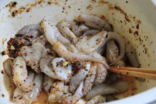 Sau khi ráo nước cho bạch tuộc vào ướp cùng tiêu, hạt nêm, bột ngọt và trộn đều cho ngấm gia vị khoảng 15 phút. Đổ bột năng vào tô. Phủ thêm một lớp bột chiên giòn ra ngoài bạch tuộc để tạo độ giòn hơn khi ăn bạch tuộc.