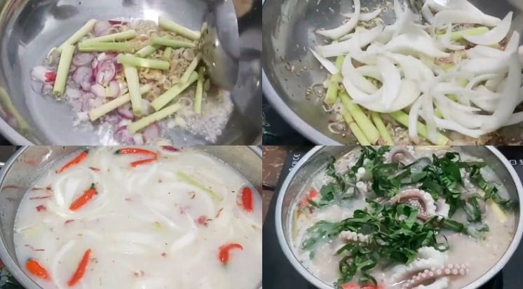 Tiếp theo cho nước cốt mẻ, 350ml nước lọc vào và nấu cho tới khi nước dùng sôi. Khi nước dùng đã sôi, bạn vớt phần bọt li ti nổi lên và nêm nếm lại cho vừa ăn, rồi cho bạch tuộc và các loại rau ăn kèm vào là món ăn hoàn thành.
