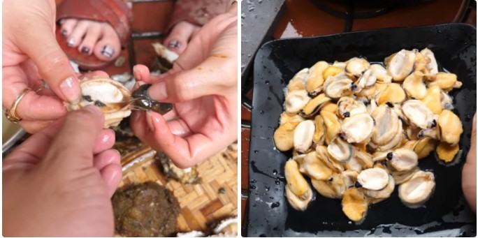 Bào ngư mua về dùng muỗng tách lấy phần thịt bào ngư, loại bỏ phần màu đen bên ngoài ruột bào ngư đi, rửa sạch để ráo chung với vỏ bào ngư sau khi được chà xát sạch đất cát.