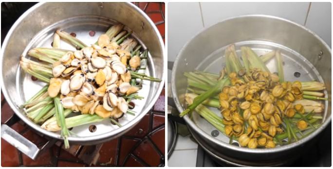 Bắc nồi hấp lên bếp có thêm 1 ít nước, chờ nước sôi đặt xửng hấp vào, cho sả đập dập lên trên. Cho hết thịt bào ngư vào, đậy nắp và hấp trong khoảng 5 phút, thịt bào ngư vàng ươm, hơi săn là được.