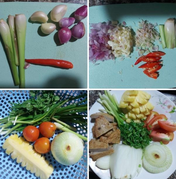 Cá thu rửa sạch, cắt lát dày 1cm, đầu cá (nếu có) chẻ đôi. Ướp với 1 ít muối cho cá cứng và ngon hơn. Để cho ráo nước. Thơm gọt vỏ, làm sạch. Cắt miếng nhỏ vừa ăn. Cà chua rửa sạch, thái múi cau. Hành tây chia làm đôi, 1 nửa thái múi cau để nấu nước lèo, 1 nửa thái sợi mỏng để ăn kèm rau sống.