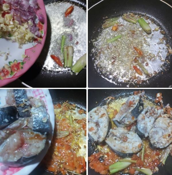 Bắt nồi to lên bếp, cho vào 1 muỗng canh dầu màu điều. Cho phần hành tỏi băm nhuyễn và sả băm và sả cắt khúc vào phi lên cho thơm. Sau đó cho 1 nửa phần thơm và cà chua vào xào. Cho 2 quả ớt đập dập vào xào cùng. Xào trong khoảng 5-7 phút khi thấy cà chua hơi mềm thì ướp với 1 muỗng cà phê hạt nêm để có vị đậm đà.