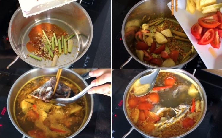 Xào thêm trong khoảng 5-7 phút, khi cà chua và thơm đã mềm thì cho 1 lít nước dừa tươi và 2 lít nước vào. Nấu sôi sủi tăm trong 15 phút. Khi nước sôi sủi tăm thì cho cá thu vào. Chú ý phải đợi nước đã sôi sủi tăm mới cho cá vào để nước lèo không bị tanh. Nêm với 1 muỗng canh hạt nêm, ½ muỗng cà phê muối, 1 muỗng canh đường phèn.