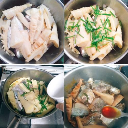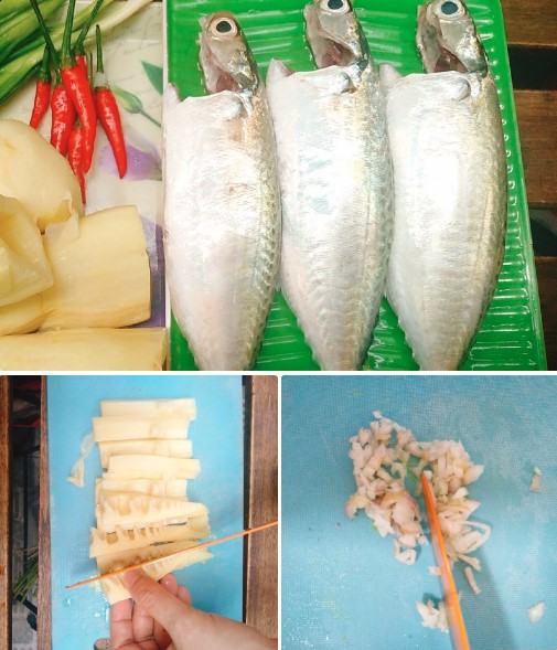 Tiếp đến phi thơm củ hành; cho cá, măng và đổ phần gia vị kho cá vào. Kho với lửa vừa, không để lửa to cá sẽ bị cháy. Sau khi cá chín và thấm đều gia vị, cho hành tím và hành lá vào rồi tắt bếp.