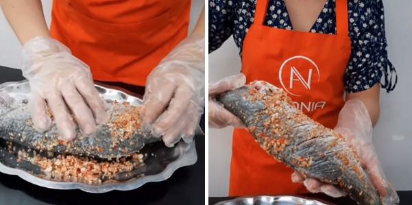 Ướp cá chẽm với 3 muỗng canh bánh tráng mè giã nhuyễn, 2 muỗng canh muối, 1 muỗng canh ớt bột, 1 muỗng canh ớt tươi băm, 2 muỗng canh sốt mayonnaise, trộn đều tất cả lên rồi chà xát nhẹ nhàng trên thân cá.
