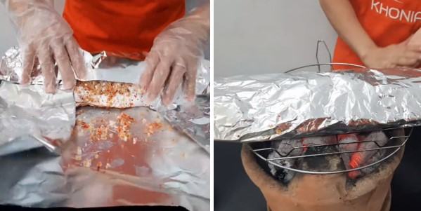 Dùng giấy bạc gói kín cá lại rồi đặt lên trên bếp than hồng, nướng trong khoảng 20 phút.