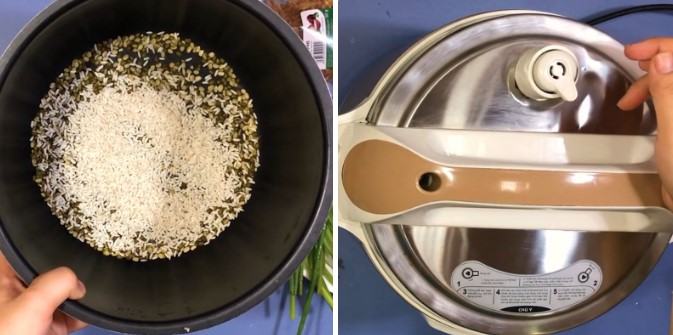 Sau khi đã đãi xong các bạn cho gạo và đậu vào nồi áp suất, thêm tiếp 700ml nước lọc, 2 muỗng cà phê hạt nêm, 1/2 muỗng cà phê muối, 1/4 muỗng cà phê bột ngọt, 1 muỗng cà phê đường sau đó bật chế độ nấu cháo và ninh khoảng 30 phút cho cháo nhừ.