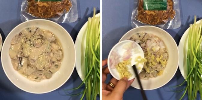 - Cho tiếp phần gừng và hành tím còn lại vào chảo, phi thơm.