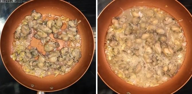 - Kế đến, trút toàn bộ phần hàu sữa đã ướp gia vị vào và đảo đều trên lửa lớn khoảng 1 – 2 phút cho hàu vừa chín săn lại thì tắt bếp, rồi rắc thêm 1/3 muỗng cà phê tiêu lên trên.