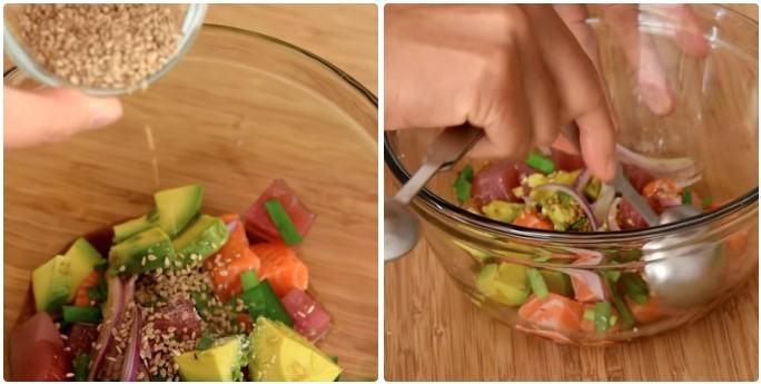 Bạn cho tất cả các nguyên liệu vào tô, tiếp theo bạn thêm vào hỗn hợp nguyên liệu gồm: 2 muỗng cà phê xì dầu, 2 muỗng cà phê sốt ponzu , 2 muỗng cà phê dầu mè, 2 muỗng cà phê mè rang.