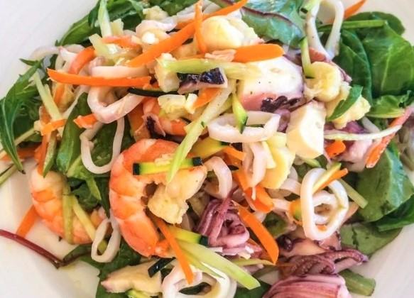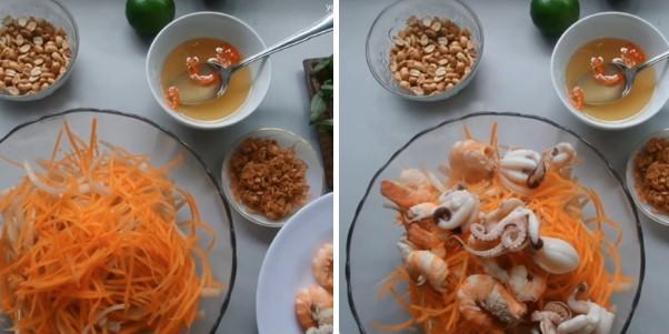 Món gỏi hải sản tôm mực này có đủ màu sắc của rau củ và hải sản rất bắt mắt. Vị chua chua, cay cay, ngọt ngọt hòa đều rất dễ ăn. Bạn có thể ăn kèm với bánh đa nướng hoặc phồng tôm. Đây được coi là món ăn thường xuyên vào ngày hè của gia đình mình. Bạn hãy bổ sung ngay vào thực đơn của mình nhé