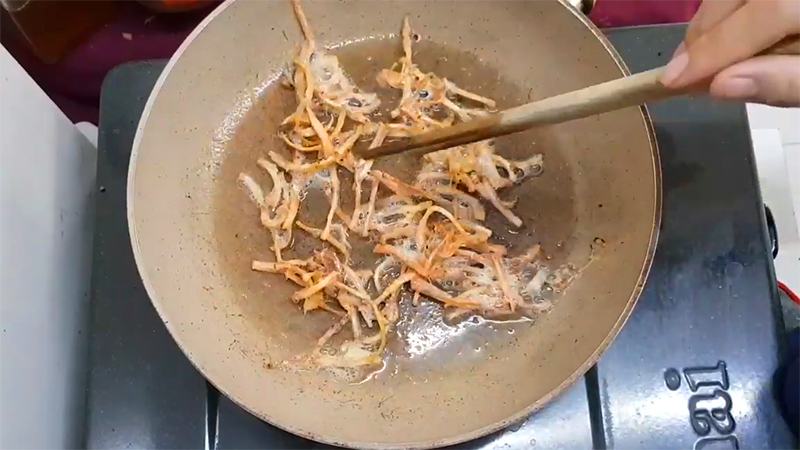 Bạn đun nóng chảo dầu trên bếp, rồi cho khô mực đã xé vào chiên ở lửa vừa đến khi mực chuyển sang vàng đều là được.