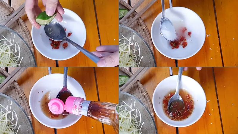 Bạn cho vào chén 1 muỗng cà phê ớt cắt nhỏ cùng ½ quả chanh, 2 muỗng canh đường và 2 muỗng canh nước mắm. Xong thì bạn khuấy đều cho hỗn hợp hòa tan hoàn toàn nhé.