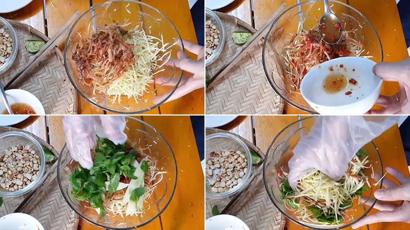 Bạn cho khô mực đã chiên vào tô cùng xoài bào sợi, nước trộn gỏi vừa pha, đậu phộng rang, húng lủi và rau răm.Cuối cùng, bạn chỉ cần trộn đều lên là đã có thể thưởng thức rồi nè.