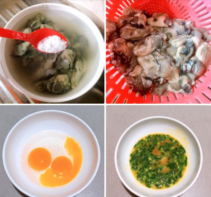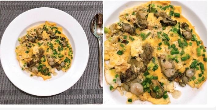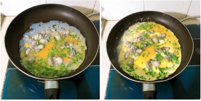 - Sau 3 phút, dàn đều hàu ra khắp chảo, sau đó đổ từ từ hỗn hợp trứng vịt vào, chiên từ 3 – 5 phút cho trứng chín là hoàn tất.