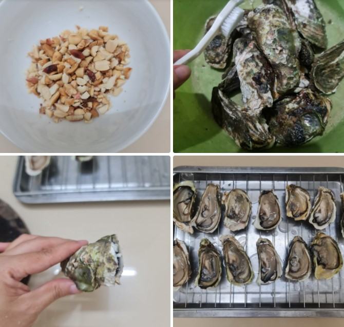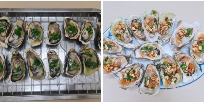 Hàu đã nướng xong thì bạn xếp ra dĩa, thêm vào 1 ít hành phi và rắc thêm một ít đậu phộng để tăng thêm hương vị cho món nướng là hoàn thành.