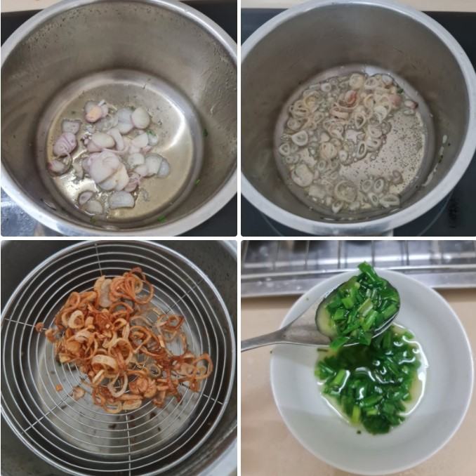 Tiếp theo, bạn cho phần hành tím đã phi vàng qua rây để lọc dầu, cho phần dầu ăn ra chén (chén ăn cơm) và cho phần hành lá đã băm vào, đảo đều là xong phần mỡ hành.