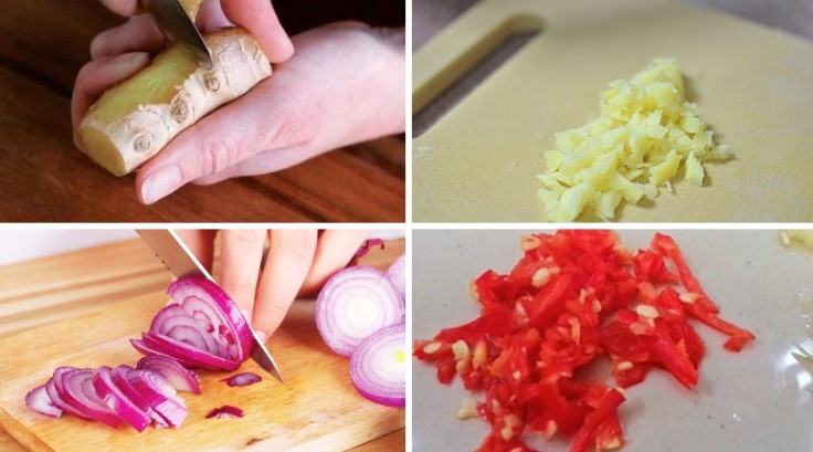 Với gừng thì bạn cạo sạch vỏ và tiến hành băm nhuyễn. Hành tím bạn nên lột vỏ, rửa sạch và băm nhuyễn. Tương tự vậy, ớt cần rửa sạch rồi cắt nhỏ vừa ăn.