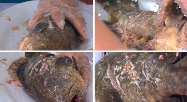 Đầu tiên, phần gừng băm nhỏ thì bạn vắt lấy nước rồi thoa lên mình cá để khử mùi tanh. Tiếp đến, lấy bã gừng và hành tím đã băm nhét hết vào bụng cá.