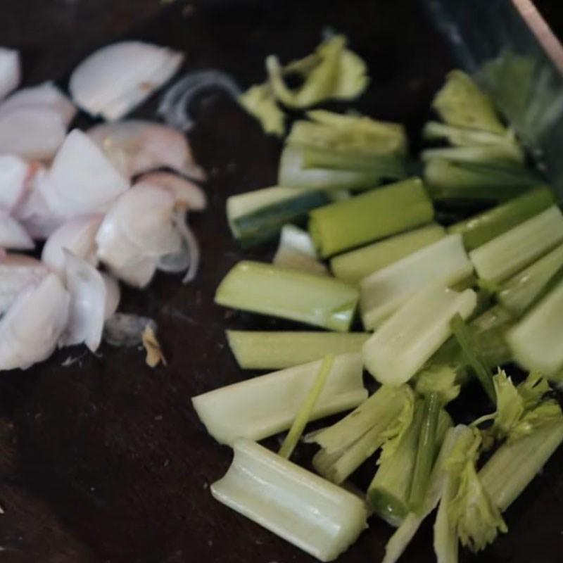 Để loại sạch bụi bẩn, cần tây và hành boa rô mua về các bạn mang ngâm với nước muối pha loãng khoảng 10 phút sau đó mang xả sạch với nước, để ráo rồi dùng dao cắt thành các khúc vừa ăn dài khoảng 1 – 2 lóng tay.