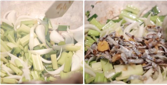 Thêm tiếp 2 muỗng canh dầu ăn vào chảo, cho cần tây, hành boa rô, hành tây vào chảo, xào ở lửa vừa hoặc lớn khoảng 2 phút cho các loại rau củ vừa chín tới thì cho sá sùng lại vào chảo.