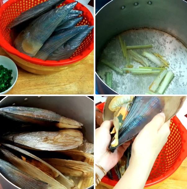 Ngâm sò mai trong nước khoảng 1 giờ cho sò sạch cát, sau đó vớt ra để ráo. Bắc nồi lên bếp, cho vào 1 ít nước, 3 cây sả cắt khúc, 1 ít gừng thái sợi, phần sò mai đã rửa sạch. Đậy nắp kín và luộc sò đến khi há miệng ra là được. Để nguội sò, sau đó tách bỏ 1 phần vỏ.