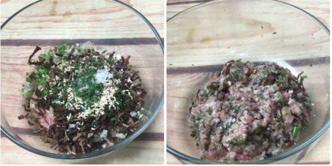 Cho vào tô 200gr thịt heo xay, rồi cho tiếp lần lượt nấm mèo, hành lá, hành tây, rau thì là đã cắt nhỏ. Ướp hỗn hợp thịt với 1 muỗng cà phê hạt nêm, 1 muỗng cà phê đường, 1 muỗng cà phê nước mắm, 1 muỗng cà phê tiêu.