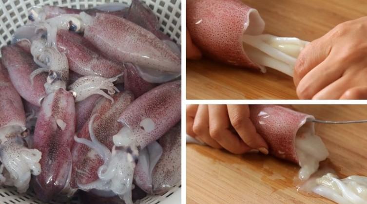 Để sơ chế mực, trước hết cần rửa sạch mực ống, sau đó tách rời phần đầu mực và thân mực. Dùng muỗng lấy sạch phần ruột bên trong thân mực, nếu túi mực bị vỡ trong lúc sơ chế, ta có thể rửa với nước sạch.
