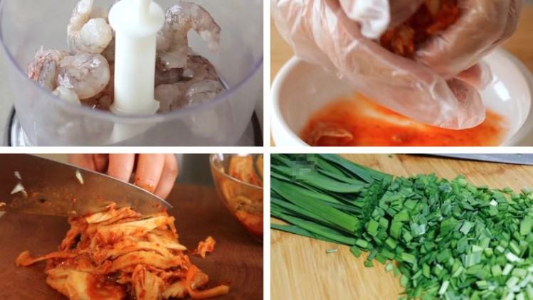 Chuẩn bị tô lớn và cho tôm xay, thịt heo xay, kim chi thái nhỏ, lá hẹ và lòng đỏ trứng gà. Sau đó thêm vào 2,5g đường, 2,5g tiêu xay, 5ml nước mắm, 2,5g ớt băm. Trộn đều các nguyên liệu trên.