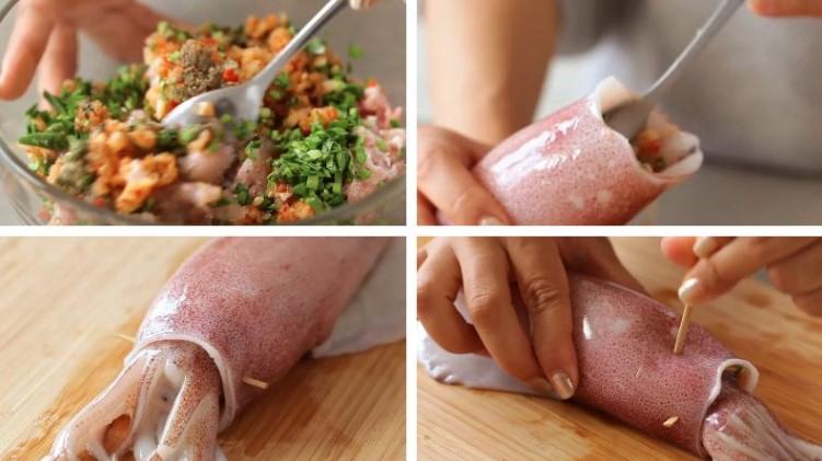 Tiến hành nhồi nhân vào thân mực, gắn phần đầu mực vào thân và cố định bằng tăm tre. Cuối cùng, dùng tăm hoặc các vật có đầu nhọn và nhỏ xiên đều lên thân mực.
