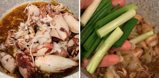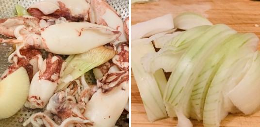 Tiếp theo, bạn nấu sôi nước với 1/2 củ hành tây, kế đến cho mực đã sơ chế vào trụng nhanh rồi vớt ra để ráo.
