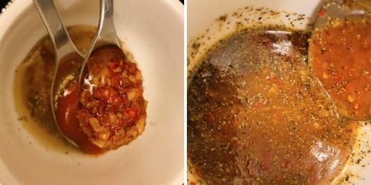Cho vào chén: 2 muỗng canh nước mắm, 1 muỗng canh đường, 1 muỗng canh sa tế ớt, 1 muỗng canh tương ớt, 1 muỗng cà phê tiêu xay, khuấy đều để hỗn hợp sốt hoà tan. Cho dầu vào chảo và làm nóng, kế đến cho ớt tỏi băm vào phi thơm.